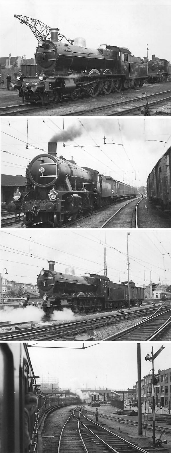 Den Haag SS, 16 juni 1956. Foto's gemaakt tijdens het door de 25-jarige NVBS georganiseerde afscheid van de houten rijtuigen van de NS. We zien loc 4502 tijdens een rangeerbeweging en loc 3737 die de afscheidstrein trekt. De onderste foto is gemaakt tussen Gvr (Den Haag SS) en Gv (Den Haag HS); rechts in beeld een rangeersein. De trein reed onder nummer 16657S van Den Haag via Rotterdam en Gouda naar Amsterdam. Vanaf de loc gezien reden de volgende houten rijtuigen mee: D3929, C5055 (nu in Spoorwegmuseum), C6111, C6131, C6172, C6374, BC6021, C6123, AB6022, AB6023. Foto's gemaakt door J. Lub; contactafdrukken collectie Nico Spilt. |