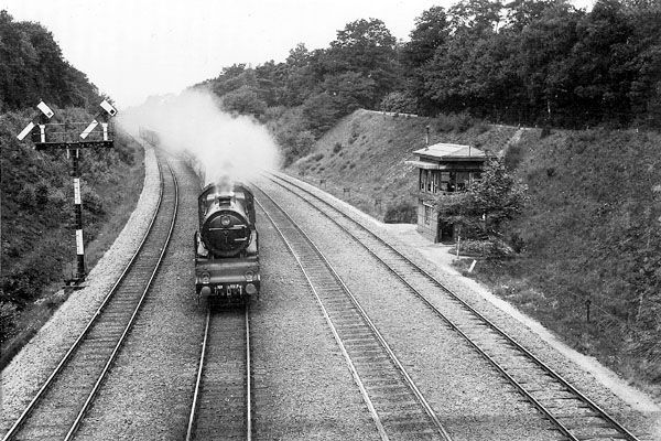 Baarn, omstreeks 1936. Loc 3917 met een trein uit de richting Hilversum. Rechts post I, links twee voorseinen in de stand "langzaam rijden". De uitrijseinen van Baarn staan dus in de stopstand. Foto collectie Adriaan Pothuizen. |