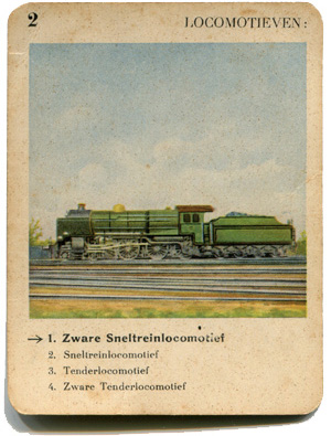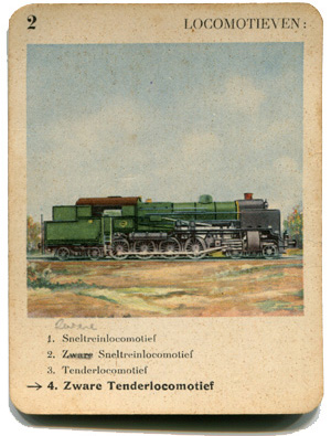Spoorwegkwartetspel, uitgegeven door de Nederlandsche Spoorwegen in de jaren dertig. Zware Sneltreinlocomotief (serie 3900). Zware Tenderlocomotief (serie 6300). |