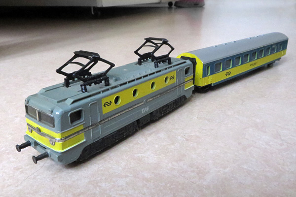NS-loc 1306 met intercityrijtuig. Trein van Berliner TT Bahnen. Het locje (twee assen) rijdt beroerd, volgens Dick van Aggelen van wie ik dit cadeau kreeg, maar ik heb er toch geen rijplannen mee. TT is wel een mooie schaal, tussen N en H0 in. |
