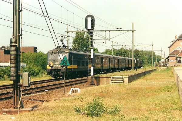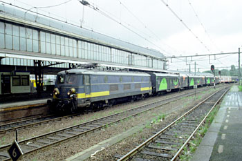 Haarlem, 21 augustus 1998. De van de NMBS gehuurd loc 2555 staat op het punt te vertrekken naar Amsterdam. De trein bestaat uit Belgische rijtuigen, waaronder een oranje pakwagen type Dms. |