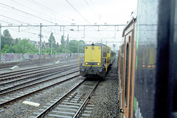 Onderweg nabij Amsterdam Sloterdijk ontmoeten we de tegentrein. Een van de vier Belgische e-locs is defect, en is daarom vervangen door de gehuurde 2207. Ik had als passagier een ruime keus aan zitplaatsen: de treinen reden vrijwel leeg heen en weer. De conducteur die onderweg een kaartje aan mij zou komen verkopen, kwam niet opdagen. Een gratis ritje dus, afgezien van de koffie die ik aan de bar in het rijtuig heb gekocht. |