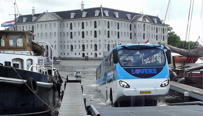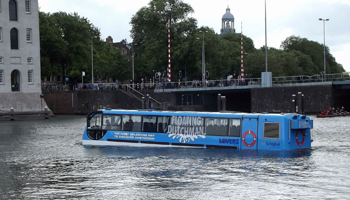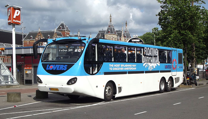 The Floating Dutchman, de blauwe amfibiebus van rederij Lovers, dreigt uit te draaien op een financieel drama. 'Dit is niet leuk meer', zegt directeur Karel Lovers in De Telegraaf van 30 oktober 2012. Hij overweegt een tweede in aanbouw zijnde busboot af te zeggen. Door aanhoudende technische storingen zei Schiphol al de samenwerking met Lovers op en is het prijskaartje van de eerste bus nu al 3 miljoen euro, in plaats van de geraamde 6 à 7 ton. Volgens Lovers wil de maker van de amfibiebus, een bedrijf in Nijmegen, nog meer geld. 'Het voelt als chantage. Een blok aan mijn been', zegt hij. Het bedrijf vindt echter dat Lovers de bus niet goed onderhoudt. The Floating Dutchman zou toeristen bij Schiphol oppikken en vervolgens na aankomst in Amsterdam direct een stukje met ze varen. Schiphol zei die samenwerking dus op en in de praktijk stond de busboot sowieso vaker stil dan dat hij toeristen vervoerde. Dat moet dus anders, bijvoorbeeld met een trein. Fotomontage Henk Koster. |