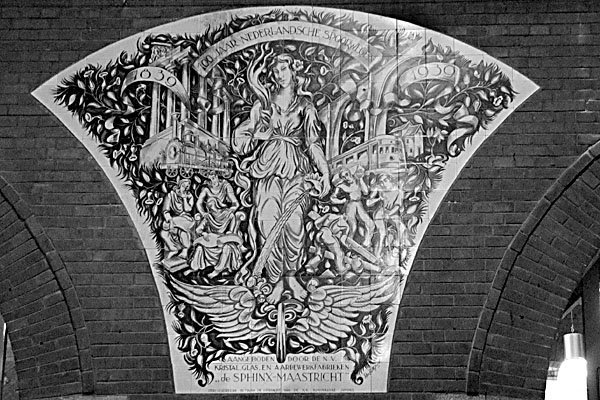 Maastricht, 19 oktober 2006. Tegelplateau in de stationshal, ter gelegenheid van het 100-jarige jubileum van de Nederlandsche Spoorwegen aangeboden door de kristal-, glas- en aardewerkfabrieken "de Sphinx" uit Maastricht. Links loc de Arend, rechts een dieselelektrisch treinstel. De vrouw boven het gevleugelde wiel heeft nu eens een keer geen blote borsten. |