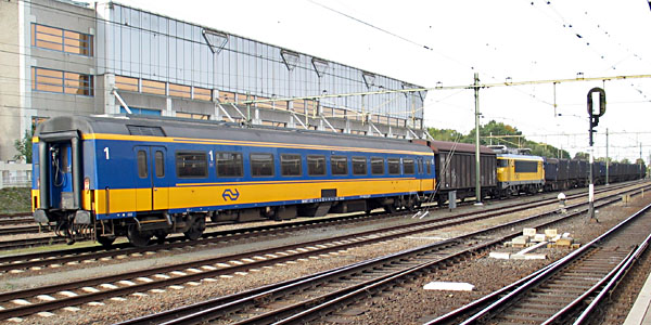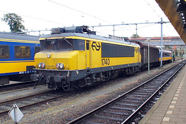 Maastricht, 19 oktober 2006. Loc 1740 "Baarn", met een Hbbins en 1e klas ICR-rijtuig 10-70 377. Foto hieronder: later op de dag zag ik deze drie voertuigen in Sittard achter een vuilnistrein hangen. Ik denk dat de zending bestemd was voor werkplaats Tilburg. |