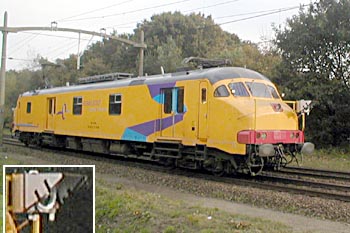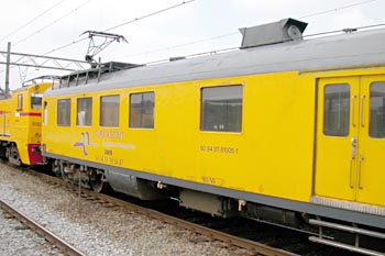 controleerde. Op de foto een dergelijk Frans meetrijtuig in Duitsland, dat achter een sneltrein uit de normale dienst