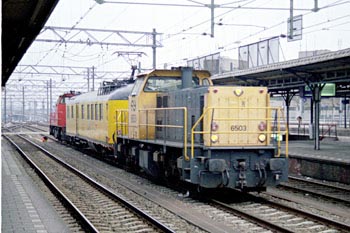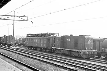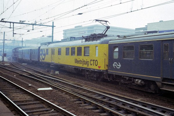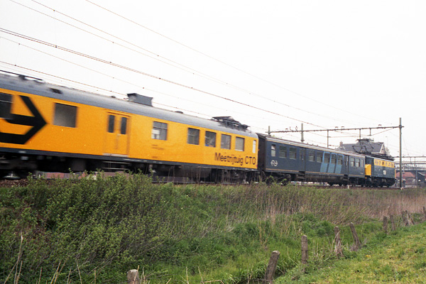 Utrecht, 11 april 2002. Meetrijtuig van het Centrum voor Technisch Onderzoek (CTO) tussen loc 6503 en 6404.