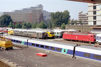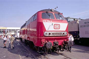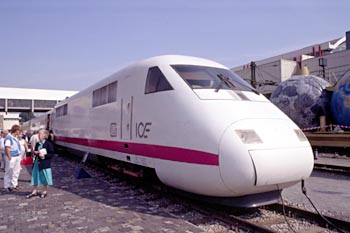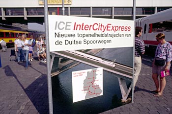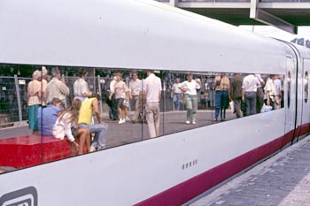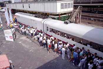 Utrecht, 6 augustus 1989. Op de plek waar eerst het Franse TGV-stel werd tentoongesteld, werd later de Duitse ICE (410.001) neergezet. In tegenstelling tot de TGV kon dit treinstel niet op eigen kracht door Nederland rijden. Hiervoor werd loc 218 138 ingeschakeld. De foto rechtsboven en de twee onderste foto's zijn door mijn broer Leo gemaakt. |