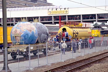 Utrecht, 20 juli en 3 augustus 1989. Een beschilderde bollenwagen: de ene bol als aarde, de andere als maan. Deze wagen is later verhuisd naar Riekje Buivenga. Op de eerste foto treinstel 772. |