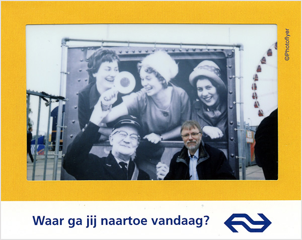 Amersfoort, 17 oktober 2014. Ik ging vandaag naar de spoorparade. Daar werd deze polaroidfoto van mij gemaakt. Ja, die techniek bestaat ook nog steeds. De foto op de poster is gemaakt in 1961. De vrouwen zijn drie verpleegsters in opleiding die in de zogenoemde Feeëntrein zitten. Dit is een trein die dames vroeger naar het Assaut in Den Helder bracht, een gala voor adelborsten: jonge mariniers in opleiding. De drie vrouwen zijn Ireen Kees, Joks van Veen en Hannie Vooragen. In DWDD van 10 oktober 2014 waren ze te zien toen deze foto opnieuw werd gemaakt. |