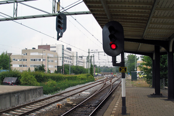 Naarden-Bussum, 1 juli en 5 augustus 2003. Sein 34, laag uitgevoerd om onder de perronkap te passen. In 2019 is dit sein verdwenen tijdens de grote ombouw van het station, waarbij ook Post T in de achtergrond tegen de vlakte ging. Op de plaats van de flats stond vroeger de fabriek van Langcat, waar emaillen borden en later ook borden op plastic en andere materialen werden gemaakt. In 1970 heb ik een aantal weken in die fabriek gewerkt; met een grafeermachine maakte ik daar teksten op plastic bordjes. De fabriek is in 1985 gesloten en werd daarna gesloopt om plaats te maken voor woningen. In een van de flats heeft mijn broer een tijd gewoond. Langcat bestaat nog steeds: de fabriek staat nu in Laag-Soeren. Ze doen alleen nog emaille.