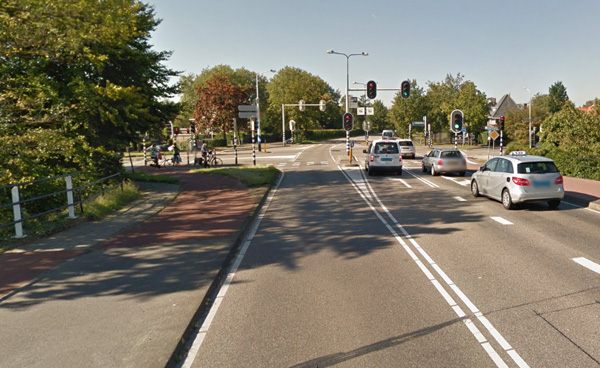 Naarden, 27 oktober 1955. Een Sik met twee wagens van de Chemische Fabriek Naarden is op weg naar station Naarden-Bussum. Het konvooi kruist de Rijksweg en rijdt nu de Lambertus Hortensiuslaan in. Rechts het pompstation van autobedrijf Dick Visser. In kleur de situatie anno 2015 (bron: Google StreetView). |
