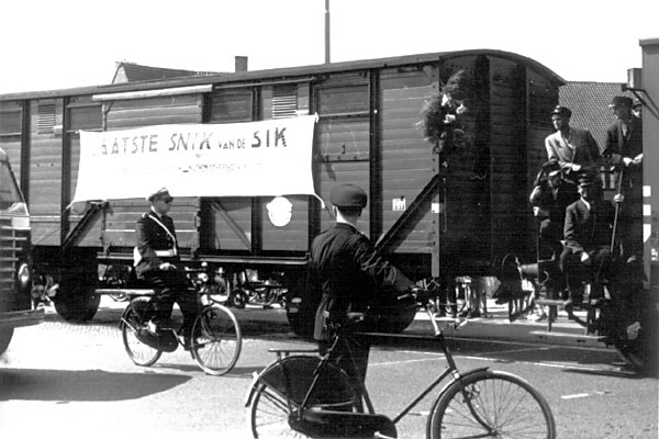 Naarden, kruising Lambertus Hortensiuslaan-Comeniuslaan, 31 juli 1958. Op het spandoek staat "De laatste snik van de sik". De politieman met witte pet is H.C. Overeem, de andere politieman is korpschef Jansen. |