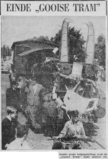Einde "Gooische Tram". Krantenknipsel uit het Parool van 31 juli 1958. De laatste rit vond plaats met de versierde Sik 250, met een konvooi tussen Bussum en Drafna. |