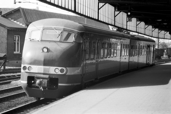 Naarden-Bussum, 26 juni 1973. Treinstel 515 komt over spoor 3 het station binnen uit de richting Amsterdam. Vanaf het perron kon je toen nog niet op de overweg komen, althans niet legaal. De overweg in de Zwarteweg/Comeniuslaan is later flink verbreed en er kwam toen ook een extra spoorboompje aan de kop van het perron. Op de achtergrond de grote seinbrug met inrijseinen. |