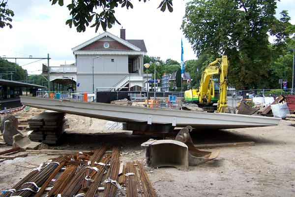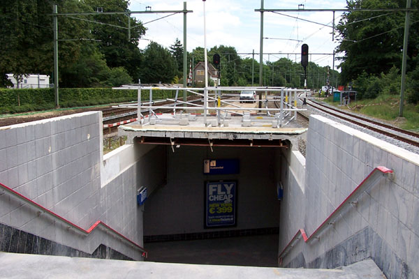 Werkzaamheden weekend 23 en 24 augustus 2008In dit weekend was het baanvak Hilversum - Baarn gestremd vanwege spoorvernieuwing. Voor specificaties zie hieronder. Het trappenhuis van het derde (zij)perron langs spoor 804 kwam in uitvoering en is inmiddels in ruwbouw gereed. Ook het betonskelet is gestort en de staalconstructie is geplaatst. Deze trappen worden zomogelijk minder steil gemaakt en bij de ingang van de tunnel is een nieuwe vloer gestort.