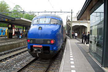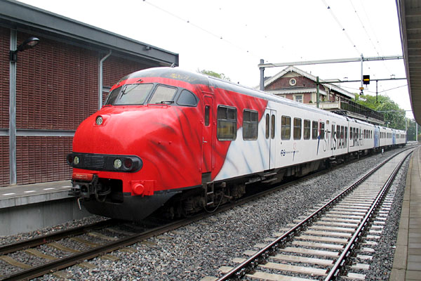 Baarn, 30 april 2010. Treinstel 520 als "vrijheidstrein" op spoor 1. Dit treinstel had niet de primeur: deze eer viel op 27 april te beurt aan treinstel 766 dat spoor 1 mocht komen ontroesten. De muur links is van de nieuwe fietsenstalling. Het in de lucht hangende herhalingssein stond aanvankelijk plompverloren op een paaltje in spoor 1. Foto Nico Spilt. |