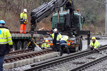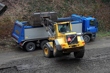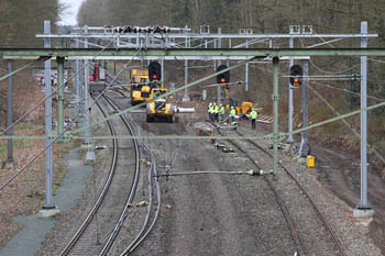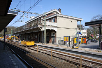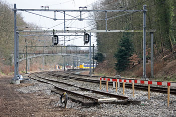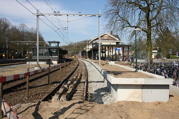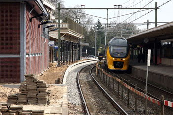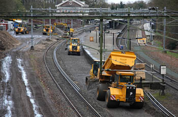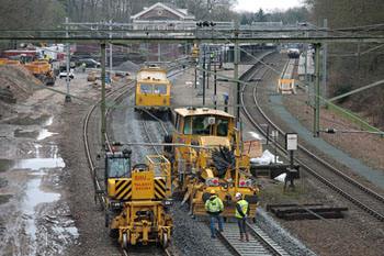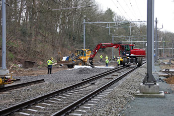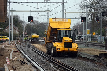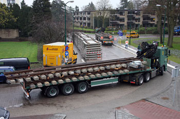 Werkzaamheden spoor 802Naast het weer in gebruik stellen van spoor 801, werd er ook gewerkt aan de vernieuwing van spoor 802. Deze werkzaamheden vonden plaats tijdens een buitendienststelling op 3 en 4 april. Spoor 802 was het laatste spoor op het Baarnse emplacement dat nog bestond uit houten biels. Het werd nu tijd om deze te vervangen door zware betonnen exemplaren. Waarschijnlijk als gevolg van de geringe ruimte en -spoorcapaciteit op het emplacement Baarn kon de gebruikelijke wijze van aan- en afvoer van ballast - namelijk per trein - niet worden toegepast. Alle benodigde materialen werden over de weg door vrachtwagens aangevoerd, ook alle ballast. Daar zorgde een groot aantal vijfassige kippers voor. Achter het inmiddels gesloopte oude gedeelte van perron 1 dumpten de trucks hun lading, waarna deze vervolgens achteruit reden langs spoor 801 in de richting van de voetgangersbrug om via een shovel de retourlading in ontvangst te nemen; de oude ballast van spoor 802. Vanaf de brug hadden geïnteresseerde toeschouwers een dynamisch en fascinerend overzicht op de georganiseerde chaos onder hen. Terwijl in noordelijke richting via het smalle pad langs spoor 801, de wissels 14A en 14B in grote hapklare brokken en in de juiste volgorde van montage op trailers werden aangevoerd, waren in zuidelijke richting een bulldozer, diverse shovels en knikdumpers bezig het ballastbed van spoor 802 te vervangen. |