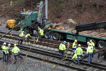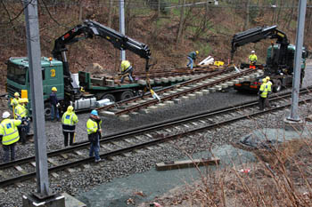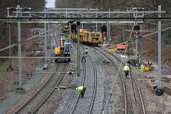Baarn, 25 maart t/m 4 april 2010. Foto-impressie van de werkzaamheden. De grootste klus was het installeren van twee nieuwe wissels 14A en 14B, die op drie grote trailers werden aangevoerd. Verder werd de ballast vernieuwd en vonden diverse werkzaamheden plaats aan het eerste perron. Foto's Henk Koster. |