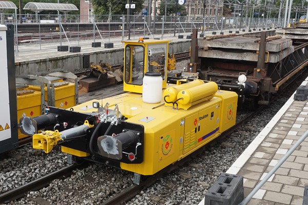 Amsterdam, 22 augustus 2025. Minirangeerlocomotiefje van Strukton: de Zagro E-Maxi. |