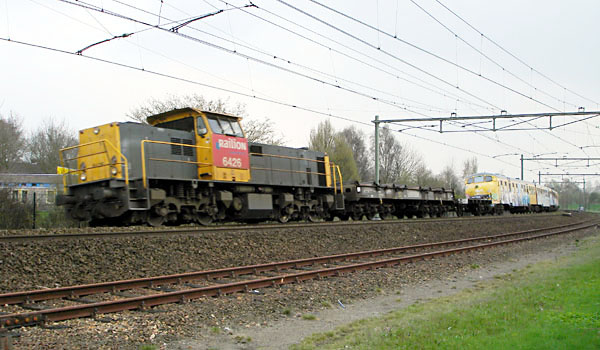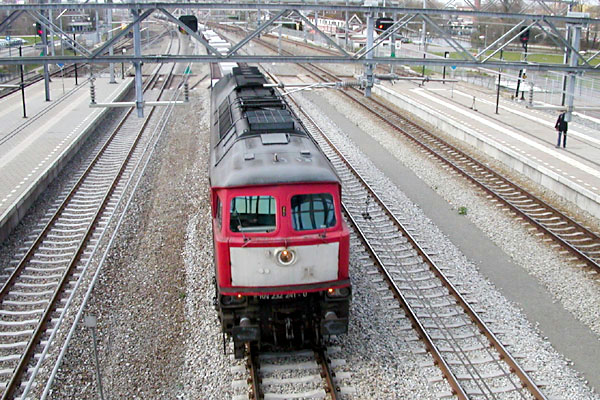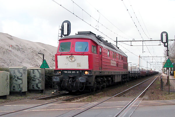 Woerden en Vleuten, 12 april 2006. In Woerden zag ik loc 232 241 onder mij doorrijden met trein 47731 (Rotterdam-Singen). Bij Harmelen zag ik dat ze deze zware trein hadden stilgezet om mijn stoptrein naar Utrecht te laten passeren. Dus bij Vleuten kon ik de loc voor de tweede keer fotograferen. De zandduinen aldaar hebben te maken met de toekomstige viersporigheid op deze plek. Loc 232 241 is een van de twaalf Russenschrecke van Railion Nederland. |