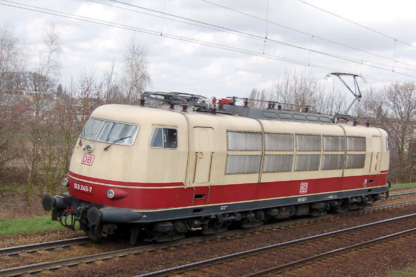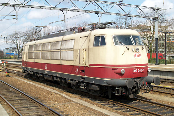 Venlo, 8 april 2006. Loc 103 245 bracht een gezelschapstrein over de grens en ging haar eentje weer terug naar Duitsland. Foto's Remco van den Bosch en Arne Vermeulen. |