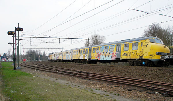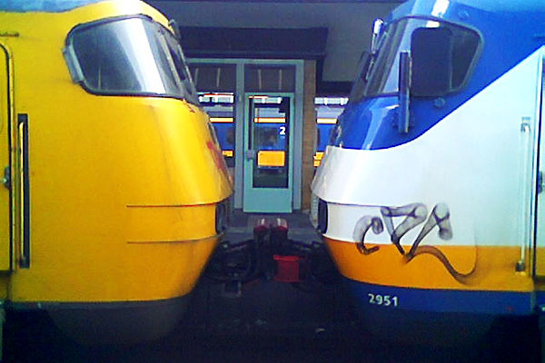 Rotterdam Centraal, 2 april 2006. Jeffrey Mons fotografeerde deze gekoppelde Sprinters: SGM 2891 en SGMm 2951. Aanvankelijk was het gekoppeld rijden van oude en gereviseerde Sprinters niet toegestaan. Dit omdat de remleidingen van de oude stellen vervuild waren met water en olie; men wilde niet dat dat bij de gereviseerde stellen ook gebeurde. Sinds dit probleem is verholpen mogen oud en nieuw wel gekoppeld met elkaar dienstdoen. (Van verschillende aanzetversnellingen is naar verluidt geen sprake.) |