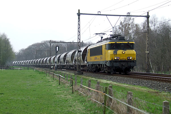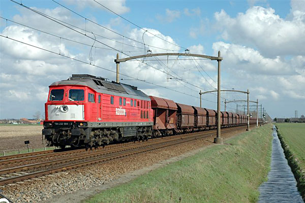 Hulten, 1 april 2006. Tussen Breda en Tilburg is loc 232 904 op weg met de ernstig vertraagde ertstrein 48720. Foto Rob van der Rest. |
