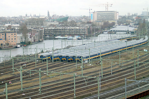 Amsterdam Dijksgracht, 12 april 2006. De motteballenvloot van NS Reizigers, bestaande uit tientallen ICK-rijtuigen. Op het achterste spoor laat een DE2 zijn snuitje zien. Dit is DE2 180, daarachter staat de rode DE3 113. Beide stellen zijn van de HIJSM: Haarlem-IJmuidense Spoorweg Maatschappij. Foto Remco Snellenberg. |