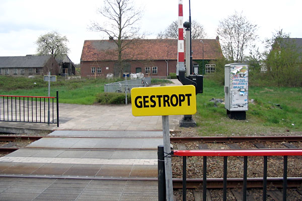 Vierlingsbeek, 28 april 2006. Op de Maaslijn vinden werkzaamheden aan het spoor plaats. Bij veel spoorwegovergangen hangt een geel bordje met het woord "gestropt" erop. Dit betekent dat de overweg buiten werking is gesteld door een monteur, zodat men zonder problemen kan werken aan de spoorbaan. Een werktreinbegeleider kan de overweg in werking stellen wanneer een werktrein passeert. Met dank aan Stefan Toonen. |