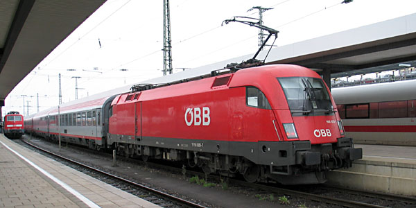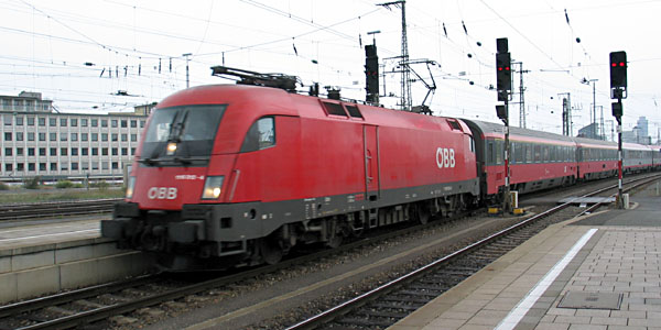Nürnberg Hbf, 15 augustus 2005. Twee Taurussen van de ÖBB lopen aan het eind van de dag binnen met een lange trein uit Oostenrijk. De twee locomotieven zijn multiple geschakeld, dat wil zeggen dat ze allebei tractie leveren. Ze worden vanuit de voorste locomotief bediend; de twee locomotieven zijn door middel van een stuurstroomkabel (die onder de hele trein doorloopt) met elkaar verbonden. Zou de achterste loc geen tractie leveren maar meegesleept worden, dan zeg je dat deze loc in opzending meerijdt. Multiple rijden kan natuurlijk ook als beide locomotieven aan de voorkant van de trein zijn gekoppeld. Zie de foto's hieronder. |