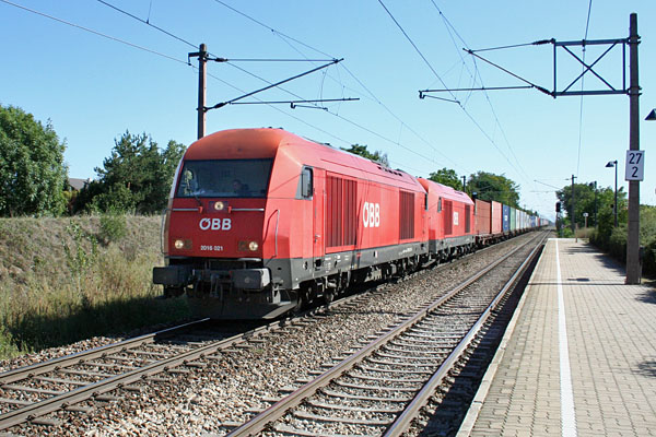 Silberwald, 28 augustus 2012. Herculessen (Herculae?) 2016 021 en 011 met een goederentrein op weg naar Wenen. Sinds 6 augustus rijden ook op de Oostenrijkse Nordbahn de treinen rechts. |