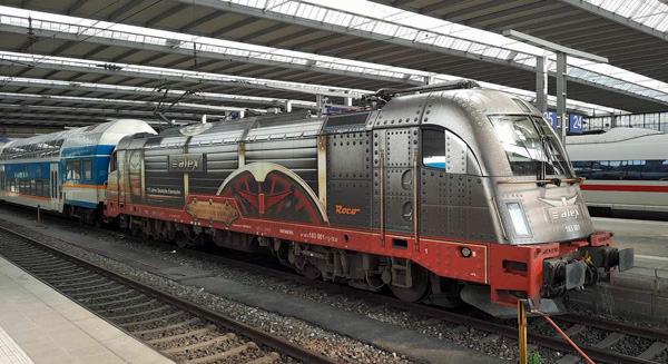 München Hbf, 23 augustus 2023. Alex-loc 183 001 maakt reclame voor Roco. Baureihe 183 is afgeleid van de Taurus. Alex is een spoorwegmaatschappij die in Beieren actief is. De naam betekende oorspronkelijk Arriva-Länderbahn-Express. Je schrijft alex met een kleine letter. Foto Jan de Kroon. |