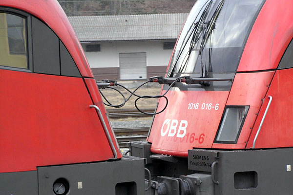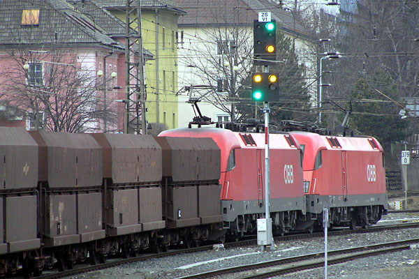 Villach West, februari 2007. Twee Taurus-locs zijn met een 1000 ton ertstrein uit Italië binnengekomen en rijden verder richting Salzburg. De locs zijn multiple geschakeld zodat ze de steile Tauern-spoorlijn op kunnen. De 20.000 pk die ze samen hebben, zullen ze daarvoor nodig hebben. Op de onderste foto het uitrijsein: boven het hoofdsein dat aangeeft dat de trein 40 km/uur mag rijden, daaronder het voorsein dat aangeeft dat het volgende hoofdsein ook 40 km/uur toont. Op de foto’s zien we dat de voorste loc, de 1016 016, de voorste stroomafnemer op heeft staan terwijl de achterste, de 1116 216, de achterste stroomafnemer gebruikt.