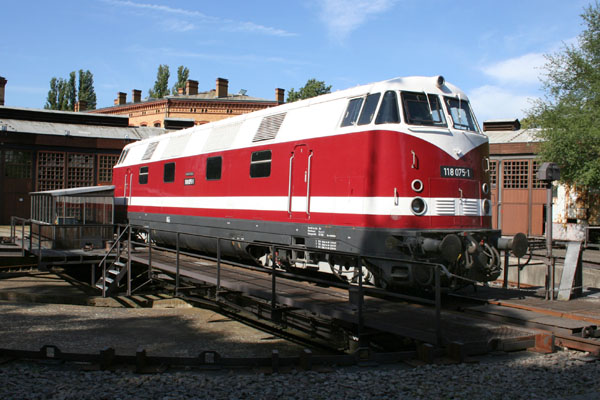 Berlijn, 25 augustus 2009. Loc 118 075 (DR V118) op een van de draaischijven van het Deutsches Technikmuseum. |