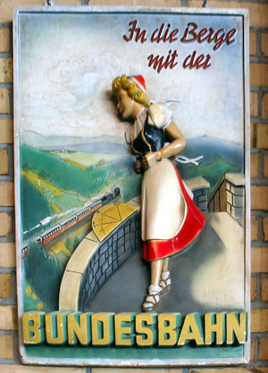 Berlijn, 25 augustus 2009. Heidi kijkt naar een stoomtrein. Driedimensionale wandplaat in het Deutsches Technikmuseum, jaren vijftig. De Deutsche Bundesbahn heeft bestaan van 7 september 1949 tot 1 januari 1994. De afkorting DB wordt nog steeds gebruikt, maar betekent nu Deutsche Bahn. |