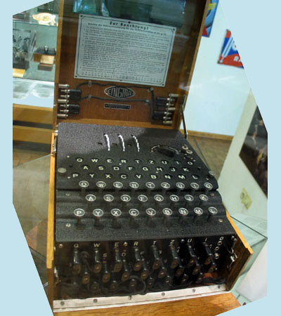 Deutsches Technikmuseum, 27 augustus 2009. Een codeermachine (Enigma) van de Duitse Wehrmacht. Met dit soort machines werden tijdens de oorlog versleutelde berichten verstuurd. Wat de Duitsers niet wisten, was dat de geallieerden al vrij snel in staat waren om de sleutel te breken. Dit was onder andere het werk van Alan Turing, een geniaal Brits wiskundige. Die kwam na de oorlog in grote problemen vanwege zijn homoseksualiteit. Hij werd gedwongen chemische castratie te ondergaan en pleegde enkele jaren later zelfmoord. Eind 2013 is hij door de Britse regering gerehabiliteerd. |
