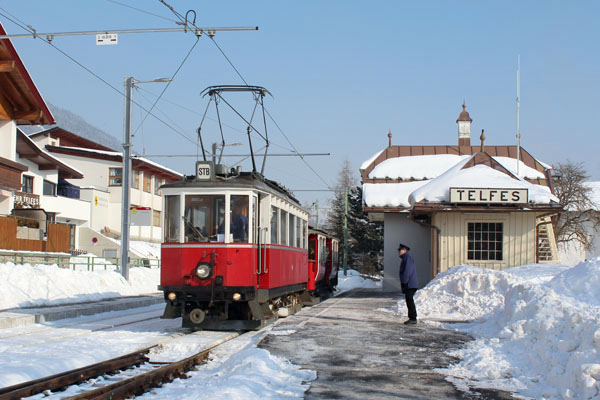 Telfes, 12 februari 2012. Tram van de Stubaitalbahn, tijdens een door de Stichting NVBS-Excursies (SNE) georganiseerde rit. Foto Adela Burger. |
