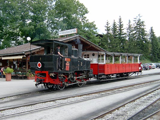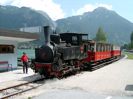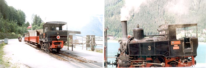 Remco Snellenberg maakte op 17 juli 2005 deze foto's op de Achenseebahn in Oostenrijk, met zijn typische schuingebouwde tandradstoomlocjes. De ketel staat zo schuin om te voorkomen dat de vuurkist aan de bovenkant droog komt te staan op de steile hellingen van deze lijn. In het station Jenbach (bovenste foto) komen treinen met drie verschillende spoorwijdten bij elkaar: de Achenseebahn (meterspoor), de Zillertalbahn (760 mm) en de Österreichischen Bundesbahnen (normaalspoor). De onderste foto is gemaakt bij de Achensee. De rit duurt 45 minuten. |