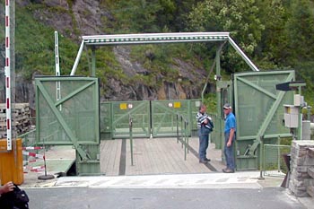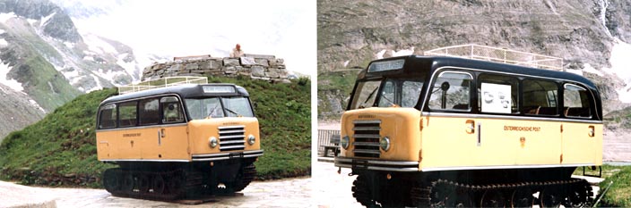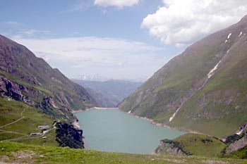 Moosersperre, 10 juli 2004. Postbus op rupsbanden, nu als monument opgesteld bij dit in de Tweede Wereldoorlog door dwangarbeiders aangelegde stuwmeer. De toeristen worden tegenwoordig met een enorme op rails rijdende lift naar boven gebracht. Foto's door mijn moeder (bus) en mijn dochter Charlotte. |
