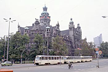 Dresden, 29 september 1979. Verboden voor paard en wagen. Op de rechterfoto een Tatra-tramstel. Op de onderste foto een tram op de Georgi-Dimitroff-Brücke, zoals de Augustusbrücke in de DDR-tijd heette. In de achtergrond het silhouet van de uitgebrande Hofkirche. Klik hier voor meer foto's in Dresden. |