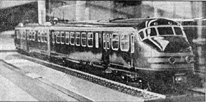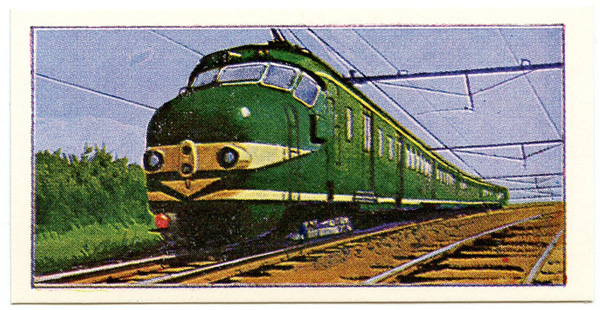 Allstrom-Fernreisetriebzug. We zien een zesdelig treinstel dat met 250 km/uur kan rijden, en dat geschikt is voor vier verschillende stroomsystemen. Kortom de ICE avant la lettre. De cabine is duidelijk afgekeken van de Nederlandse Hondekop, maar dan met een Duitse koppeling en Duitse front- en sluitseinen. Knipsel uit een onbekend tijdschrift dat in 1966 (een jaar na de genoemde Internationale Verkehrsausstellung in München) moet zijn verschenen. |