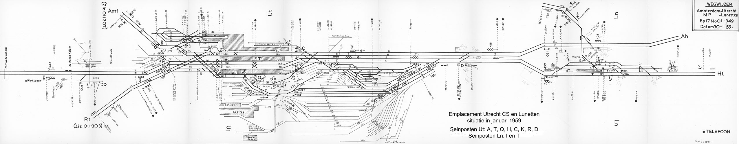 Toen Utrecht nog geen doorstroomstation was. Tekening uit de collectie van Kees van de Meene. Met hoofdletters zijn de posten uit die tijd aangegeven. Van links naar rechts: