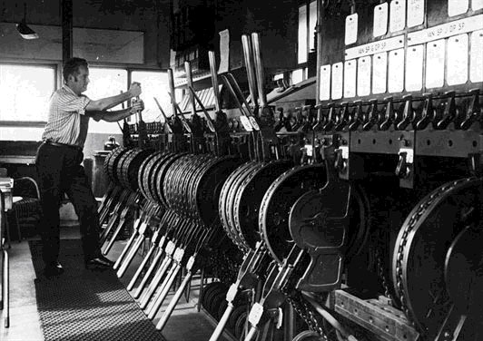 Omroepster Utrecht CS. Ze kan vanuit Post T uitkijken over de perrons. In het midden van de foto een bak met ponskaarten waarmee ze de treinaanwijzers instelt. Voor elke trein is er een ponskaart waarin perronnummer, bestemming en vertrektijd zijn geprogrammeerd. Foto: jaarverslag NS 1964. |