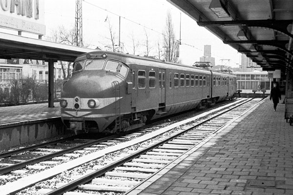 Utrecht CS, 27 december 1968. Vijfwagenstel 807 loopt binnen uit de richting Amsterdam of Gouda. Duidelijk te zien zijn de (gele) propaantanks van de wisselverwarming. Deze tanks werden tijdens vorstperioden regelmatig gevuld vanuit een tankwagen. |