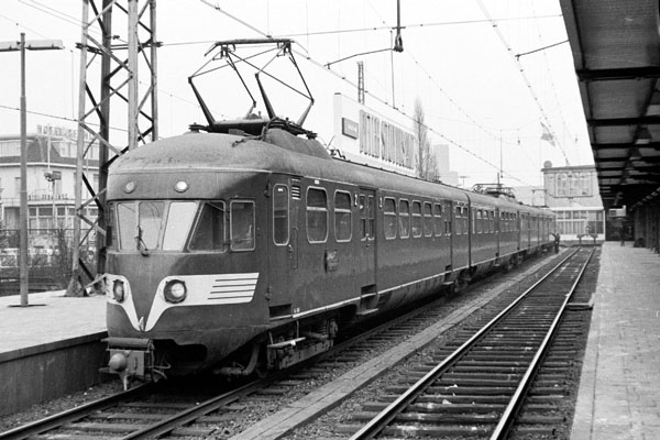 Utrecht CS, 4 juli 1969. Afgevoerd treinstel 301 (Mat.40), gefotografeerd vanuit een trein uit Hilversum. Achter de bomen links bevindt zich de lijnwerkplaats. Deze bomen vormden samen "het bos van Den Hollander", dat in de jaren 80 plaats heeft gemaakt voor een opslagterrein van Electrorail. Het bos was in de jaren 50 aangelegd in opdracht van president-directeur Den Hollander, na de sloop van de daar gelegen werkplaats voor getrokken rijtuigen. (Bron: OdR 1992 blz. 85) |