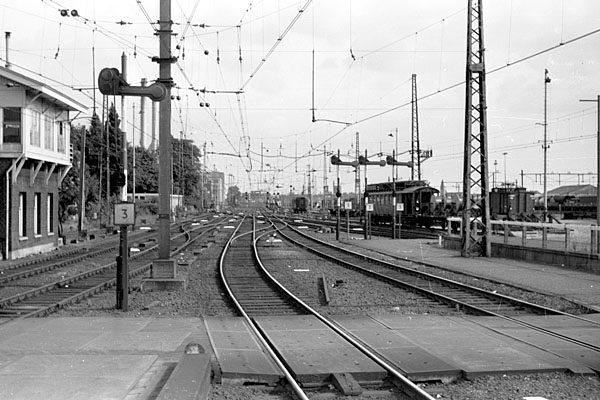 Utrecht CS, 23 oktober 1969. Loc 1111 onder de over de sporen gebouwde Post T. Van hieruit werden de seinhuizen langs het emplacement aangestuurd, totdat alles werd ondergebracht in een nieuwe Post T. Tegenwoordig bevindt zich op deze hoogte de stationshal. |