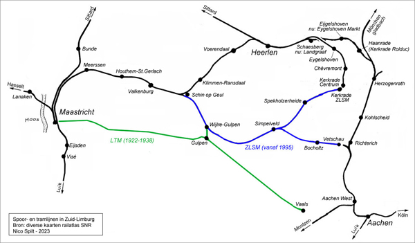 Railvervoer in Zuid-LimburgZie ook het kaartje verderop. In 1845 werd de Aken-Maastrichtsche Spoorweg-Maatschappij (AM) opgericht. Zoals uit de naam blijkt was het doel om treinen te laten rijden tussen Aken en Maastricht. In 1847 begon de aanleg en in 1853 reed de eerste trein. Uit dat jaar stamt ook het oudste nog bestaande station van Nederland: Valkenburg. In 1856 werd de lijn vanuit Maastricht doorgetrokken tot Hasselt. Zo ontstond een rechtstreekse verbinding tussen Antwerpen en Aken. Nadat de AM in financiële moeilijkheden kwam, werd ze in 1867 overgenomen door Grand Central Belge (GCB). In 1898 kwam het Nederlandse deel van de lijn in handen van de Staatsspoorwegen, later de NS. In 1872 was vanuit Simpelveld een zijtak aangelegd naar de Domaniale mijn in Kerkrade. In de jaren 30 werd deze zijtak verlengd tot Schaesberg. Vanwege de enorme kosten kreeg dit traject de bijnaam Miljoenenlijn. Tijdens de Tweede Wereldoorlog werden in Limburg enorme vernielingen aangericht aan het spoorwegnet. Na de oorlog kreeg het herstel van het binnenlandse verkeer voorrang, vooral het kolenvervoer naar de rest van Nederland. De lijnen van Sittard naar Maastricht en naar Heerlen werden geëlektrificeerd. Ook tussen Maastricht en Heerlen kwam bovenleiding. Hier gingen vanaf 15 mei 1949 de toen net afgeleverde treinstellen mat.'46 rijden. Pas op 23 mei 1954 werd de internationale reizigersdienst tussen Maastricht en Aken hersteld. Aanvankelijk met een Duits dieselmotorrijtuig met stuurstandrijtuig. Daarna volgden Duitse railbussen (VT 95) en vanaf 1961 een inmiddels rood geschilderde Blauwe Engel (DE1) van NS. Met ingang van 26 mei 1963 werden alle treinen gereden door een DE1. Daartoe waren de motorrijtuigen 40-44 voorzien van Indusi, het Duitse treinbeïnvloedingssysteem. Van 1977 tot 1988 reden er Duitse accutreinen (ETA 515) op het traject. Door de vele hellingen raakten de accu’s snel uitgeput, zodat er wel vier accutreinen nodig waren voor de acht slagen per dag. In 1988 werd de reizigersdienst tussen Kerkrade en Simpelveld opgeheven. Hierdoor kwamen er dieseltreinstellen vrij die de dienst konden overnemen van de accutreinen. Drie gerenoveerde DE2'en (171, 178 en 179) werden hiertoe van Indusi voorzien. In 1992 werd de dienst van Maastricht via Simpelveld naar Aken opgeheven. Voortaan reden de treinen vanaf Heerlen via Herzogenrath naar Aken. In 1998 werden de DE2-stellen opgevolgd door DM’90 (Buffels). Hiertoe waren de treinstellen 3431-3433 van Indusi voorzien om in Duitsland te mogen rijden. In 2001 nam de DB de dienst over van NS en gingen er treinen rijden onder de naam Euregiobahn. Hiervoor werden dieseltreinstellen (Talent) ingezet. Over de lijn via Haanrade naar Herzogenrath reden decennialang alleen goederentreinen. Wie vanuit Nederland naar Herzogenrath wilde, moest dus een flinke omreis maken. Of een flinke wandeling. Kerkrade en Herzogenrath liggen tegen elkaar aan; de grens loopt dwars door een woonstraat. In 1969 is de auteur van dit artikel een paar keer vanuit Kerkrade naar Herzogenrath gelopen om daar de stoomtreinen te zien die met veel geweld vertrokken om de helling bij Kohlscheid te trotseren. De lijn van Heerlen naar Herzogenrath is in 2018 geëlektrificeerd. In 2021 is het gedeelte tussen Heerlen en Landgraaf (voorheen Schaesberg) verdubbeld. Sinds 2018 rijdt Arriva met elektrische treinstellen (Flirt) van Aken via Heerlen naar Maastricht. De plannen zijn om vanuit Maastricht door te rijden naar Luik, zodat er een Drielandentrein ontstaat. Door allerlei verwikkelingen is dat er nog niet van gekomen. Er zijn plannen geweest om een kortere verbinding te realiseren tussen Kerkrade en Aken. Hiertoe zou van Spekholzerheide tot Vetschau een nieuwe spoorlijn moeten worden aangelegd. Deze zogeheten Avantislijn is er nooit gekomen. De reizigersdienst tussen Maastricht en Hasselt is in 1954 gestaakt, de goederendienst in 1992. Er zijn vanaf 2011 nog wel enkele pogingen gedaan om het goederenverkeer te reactiveren, maar dit is niet gelukt. Ook plannen om een sneltram aan te leggen tussen Maastricht en Hasselt zijn gesneuveld. Veel geld heeft het allemaal wel gekost. Ook kostbaar was de tramlijn van Maastricht via Gulpen naar Vaals, aangelegd door de Limburgsche Tramweg-Maatschappij (LTM). Onder andere moest hiervoor een enorm viaduct worden gebouwd bij Gulpen. De in 1922 aangelegde lijn werd in 1938 alweer gesloten en opgebroken. De LTM exploiteerde onder andere ook een elektrische tramlijn van Heerlen naar Sittard (niet getekend op het kaartje). In 1988 werd de Zuid-Limburgse Stoomtrein Maatschappij (ZLSM) opgericht. Sinds april 1995 rijdt de ZLSM met stoomtreinen vanuit Simpelveld naar Schin op Geul en naar Kerkrade. Doorrijden naar Heerlen is niet meer mogelijk, en doorrijden naar Valkenburg is momenteel niet toegestaan. Verder rijdt de ZLSM met railbussen naar Vetschau. De verbinding naar Richterich is opgebroken. Op het kaartje is aangegeven waar ooit spoorlijnen in Zuid-Limburg lagen of nog steeds liggen. De vele inmiddels verdwenen verbindingen met de kolenmijnen zijn niet getekend. In de railatlas van de SNR zijn diverse kaarten te vinden waar ze wel op staan. In Op de Rails is ook veel geschreven over het railvervoer in deze regio. Bijvoorbeeld Aken - Maastricht, het oudste grensbaanvak van Nederland door Emiel de Block in Op de Rails, november 1992 (te lezen als je bent ingelogd op nvbs.com). Dit artikel schreef ik voor NVBS Actueel van juli 2023. |