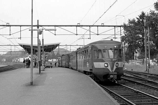 Heerlen, 21 september 1970. Motorrijtuig 45 loopt binnen. Op de tweede foto links motorrijtuig 29. Ik herinner me dat even later de stationschef met zijn spiegelei het vertreksein wilde geven, maar dat de conducteur van motorrijtuig 29 dat maar onzin vond: die gaf het vertreksignaal zelf wel. |
