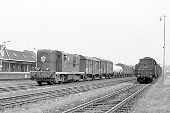 Simpelveld, 15 augustus 1970. Loc 2402 en stoomloc 050 788 wisselen wagens uit. Motorrijtuig 29 vertrekt naar Heerlen. Even later vertrekt loc 050 788 naar Aachen. Klik hier voor meer foto's in Simpelveld. |